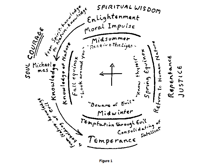 Pero algo más está conectado con esto, que ya está en los anales de lo que podría llamar de manera espiritual. Está ahí de tal forma, sin embargo, que cuando el hombre ya no tuvo un verdadero sentimiento por lo que vive en las estaciones cambiantes del año, relacionó todo ello con el ser humano. Lo que conduce a la «Iluminación» fue reemplazado por el concepto de «Sabiduría» [llamada «Prudencia» en la práctica inglesa]; luego, lo que conduce al «Conocimiento» fue reemplazado por el concepto de «Valentía» [«Fortaleza»]; «Templanza» se mantuvo igual (ver diagrama 1); y lo que correspondía al «Arrepentimiento» fue reemplazado por el concepto de «Justicia».