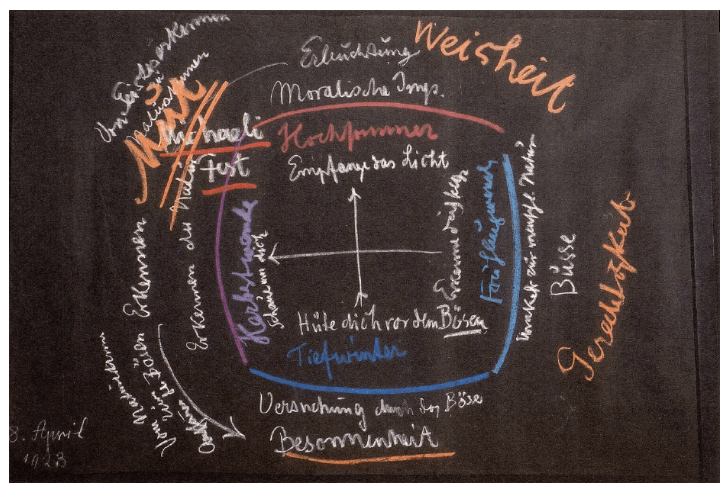 «Guárdate del Mal» también podría expresarse: «Guárdate, retírate de la oscuridad de la Tierra». Pero esto no lo decían. Mientras que durante el pleno verano los hombres aceptaban el fenómeno natural externo de la luz como Sabiduría, es decir, en pleno verano hablaban de cierta manera de acuerdo con la Naturaleza, nunca habrían puesto el lema para el invierno en la frase: «Guárdate de la oscuridad» —pues expresaban más bien la interpretación moral: «Guárdate del Mal».