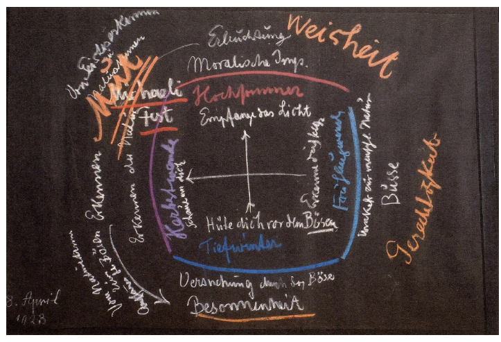 «Guárdate del Mal» también podría expresarse: «Guárdate, retírate de la oscuridad de la Tierra». Pero esto no lo decían. Mientras que durante el pleno verano los hombres aceptaban el fenómeno natural externo de la luz como Sabiduría, es decir, en pleno verano hablaban de cierta manera de acuerdo con la Naturaleza, nunca habrían puesto el lema para el invierno en la frase: «Guárdate de la oscuridad» —pues expresaban más bien la interpretación moral: «Guárdate del Mal».