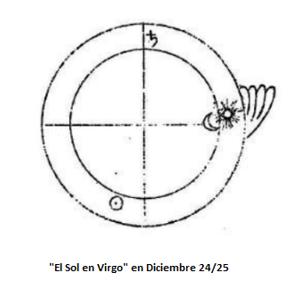Esta constelación puede registrarse como en un horóscopo ordinario; corresponde al momento previo a la medianoche de Nochebuena. Pero esto no describiría el tremendo acontecimiento que tuvo lugar en ese instante. Así como la Anunciación a María fue una preparación para este nacimiento, este nacimiento mismo fue una preparación para el misterio venidero del Gólgota. El Sol mismo resplandeció desde Virgo; espiritualmente, resplandeció en Virgo porque tuvo lugar en la Tierra un nacimiento que debe describirse como virginal en el sentido cósmico. Mediante este nacimiento, la Tierra comenzó a volverse cósmica. La semilla del Sol aún no se había depositado en ella, pero las fuerzas cósmicas habían comenzado a irradiar desde Virgo y 33 años después, las fuerzas solares directas de Cristo se unieron a la Tierra mediante su muerte en el Gólgota. Con ello, la Tierra misma se convirtió en el Cosmos. Ahora poseía en sí misma lo que antes había tenido que recibir del exterior. Las almas humanas también podían ahora absorber lo que se le había dado a la Tierra. Se convirtió en un ser diferente, adquirió una ley distinta. Adquirió su propio ritmo, el de los 33 años de la vida de Cristo. (*)