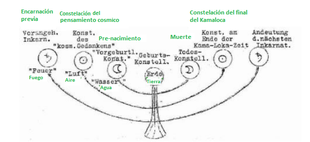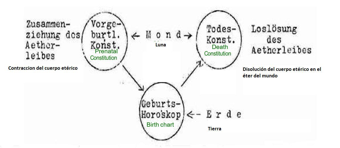 Así, la constelación de nacimiento, que se encuentra sobre el momento de la entrada en el mundo físico, se ha elaborado ahora como el punto central, y luego, partiendo de aquí, elevándose como un paso más hacia el ámbito cósmico, una constelación que, situada antes del nacimiento, apunta más a procesos lunares-etéricos. Al otro lado, la constelación de muerte aparece como una especie de paralelo, que también refleja acontecimientos en el ámbito lunar-etérico. Pues en esta constelación puede verse una imagen especular del cuerpo etérico que se desprende del ser humano, del cuadro del destino que resplandece en los primeros días.