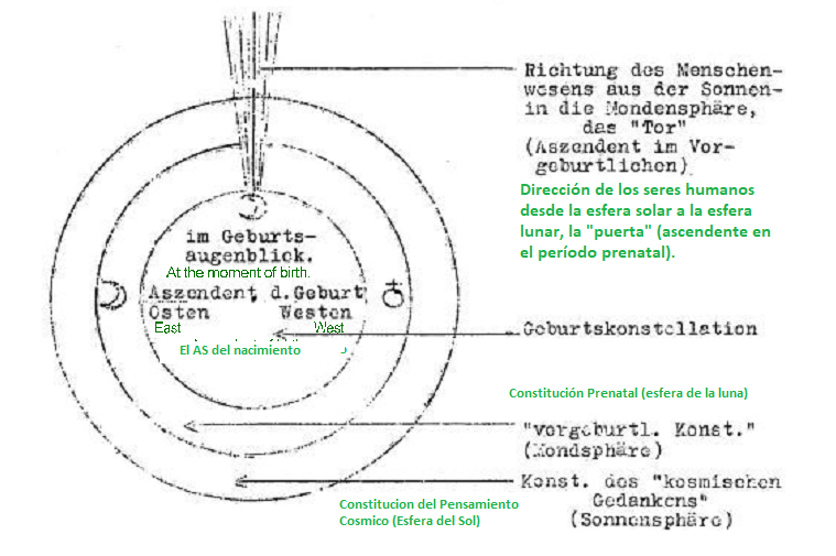 Sin embargo, esto no debe entenderse como si uno debiera intentar penetrar en los reinos de la existencia prenatal humana de manera vaga y mística. Más bien, el punto de partida para esta consideración es el horóscopo de nacimiento del ser humano. Pero mientras que el horóscopo natal se proyecta generalmente sobre la vida entre el nacimiento y la muerte, aquí se hace lo contrario: se considera el cielo estelar en el momento del nacimiento como la llave, como la puerta de acceso a las etapas de la existencia prenatal, sobre las cuales ya se ha dicho algo en la exposición anterior.