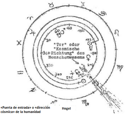 Hegel nació el 27 de agosto de 1770. La constelación de los planetas en esa fecha está inscrita en el círculo interior del dibujo adjunto. (No se conoce la hora exacta del nacimiento, pero esto no afecta significativamente el análisis realizado aquí). El círculo interior está dividido en los 12 signos zodiacales, cada uno de 30° de extensión, con los que trabaja la astrología. En el borde exterior, en cambio, se muestran las 12 constelaciones en sus diversos tamaños, de modo que, por ejemplo, ♈ denota la constelación real de Aries tal como puede verse en el cielo. En el horóscopo de Hegel, el Sol y Mercurio están en el signo de Virgo, Venus en el signo de Libra, la Luna en Escorpio, Júpiter en Sagitario, mientras que Marte aparece como figura solitaria en el signo de Géminis. Desafortunadamente, no podemos adentrarnos aquí en la reveladora imaginería de esta constelación tanto como nos gustaría. Esto también debe reservarse para más adelante. Se mencionó anteriormente que la «constelación prenatal» puede encontrarse con ayuda de la Regla Hermética basada en el horóscopo de nacimiento. Dado que no se conoce la hora de nacimiento y, por tanto, el ascendente en el horóscopo, no se puede determinar la posición de la Luna en el «horóscopo prenatal»; por ello, en el segundo círculo, el del medio, que corresponde a la constelación prenatal, solo hemos dibujado el Sol para un tiempo promedio (273 días) antes del nacimiento. En ese momento, se encontraba en el signo de Sagitario, considerando que el Sol recorrió aproximadamente tres cuartas partes de la eclíptica desde allí hasta el nacimiento (véase el dibujo). Pero continuemos. Con la constelación prenatal estamos en la esfera lunar, pero en algún momento el ser humano debe haberse movido de la esfera solar a la esfera lunar. Para ello, tuvo que atravesar la «puerta cósmica» antes mencionada. La ubicación de esta puerta está indicada por la posición de la Luna en el nacimiento; en la constelación de Hegel, este sería el signo de Escorpio, detrás del cual se ve en el cielo la constelación de Libra. Sin embargo, ya se ha dicho que la puerta solo está abierta cuando el nodo lunar se encuentra en ella. Este fue el caso de Hegel en 1762; en ese momento, el nodo lunar descendente estaba en el signo de Escorpio o en la constelación de Libra