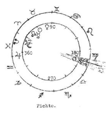 Fichte nació el 19 de mayo de 1762. La configuración planetaria de ese momento está inscrita en el círculo interior del dibujo (tampoco se conoce aquí la hora de nacimiento). Es característico de la fuerte personalidad de Fichte, que nunca se doblegaba, que casi todos los planetas se encuentren en los signos de Aries, Tauro y Géminis, mientras que Marte está en oposición a ellos. Dado que la constelación prenatal tampoco puede determinarse con precisión aquí, nos abstendremos de hacerlo y pasaremos a la «constelación de la cosmovisión» o «constelación de la esfera solar». La puerta de entrada de la esfera solar a la esfera lunar se encuentra aquí en el signo de Libra/Virgo (punto de oposición de la Luna en el nacimiento, según la Regla Hermética). En 1773, el nodo lunar ascendente se encuentra en el lugar de la puerta cósmica. Sin embargo, esto ocurre 11 años después del nacimiento. No obstante, este momento es importante para nuestra consideración, porque ahora Júpiter entra en la constelación de Piscis (dibujo del círculo exterior). La constelación de la cosmovisión aparece en la constelación exterior: logismo en el psiquismo, como corresponde a Fichte.