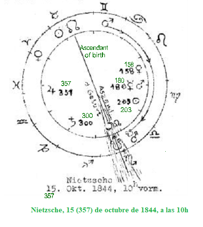 Consideremos la constelación natal en el círculo interior. Aquí se obtuvo la hora exacta del nacimiento, por lo que aparece un ascendente de nacimiento. La esencia de Nietzsche se nos presenta aquí de manera vívidamente gráfica desde cierto ángulo en la conjunción de Marte y Mercurio, que están exactamente a 180° de la eclíptica, es decir, en Libra y al mismo tiempo en el meridiano del lugar. Júpiter está significativamente en oposición a esto. Sin embargo, habría que escribir un ensayo en sí mismo para iluminar esta constelación en sus profundidades. Incluso considerar la constelación prenatal, que ahora podría determinarse con mayor precisión aquí, nos llevaría demasiado lejos. Miremos, pues, la «constelación de la esfera solar». La puerta cósmica está en el signo de Sagitario/imagen de Escorpio; en mayo de 1835, nueve años antes del nacimiento, el nodo lunar descendente entra en esta posición. Así que ahora la puerta está abierta y el aspecto cósmico es: Venus en Aries (misticismo en idealismo), Sol en Tauro (empirismo en racionalismo). Hay, pues, una concordancia total con las afirmaciones de Rudolf Steiner. Pero ahora hay más: Marte en Géminis (voluntarismo en matematismo). Como se mencionó anteriormente, Nietzsche no tiene predisposición para esto, lo que también se expresa en el hecho de que Marte en Géminis está en posición de sextil con Venus en Aries, lo cual, como dice Rudolf Steiner, es desfavorable en la «constelación de la cosmovisión» (en contraste con la carta natal). Por lo tanto, como no puede entrar en Géminis, debe saltar a la oposición con Marte al Sol en Tauro. Esto se logra porque Marte entra en el signo de Escorpio en noviembre de 1835 y se encuentra con el nodo lunar en este punto, todavía en la vecindad inmediata de la «puerta cósmica» (véase el dibujo). Así se logra Marte en Escorpio, o voluntarismo en dinamismo.