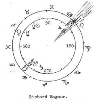 Finalmente, analicemos la constelación de Richard Wagner. Aquí tenemos el caso peculiar de que la «constelación de la cosmovisión» cae en el período poco antes de su nacimiento. La luna menguante en el nacimiento está en el signo de Acuario/imagen de Capricornio, estrechamente alineada con Marte. La puerta cósmica se encuentra, por tanto, frente a ella, en el signo de Leo/imagen de Cáncer (véase el dibujo). Unos meses antes del nacimiento, el nodo lunar ascendente pasa sobre esta ubicación; el Sol y la Luna pueden conectarse, y como constelación, es notable en este momento Venus en Aries, o misticismo en idealismo. Cuando contemplamos la obra de Richard Wagner, cómo la mitología escandinava se convirtió en el destino de su vida, cómo luchó y finalmente triunfó al elevar el mito al reino de las ideas primordiales que sostienen el mundo y la humanidad, entonces el misticismo en el idealismo bien podría parecer su cosmovisión. Esta sería también la cosmovisión en la que se acerca a Nietzsche, mientras que el propio Nietzsche está bajo la influencia del misticismo en el idealismo o Venus en Aries, como se describió anteriormente.