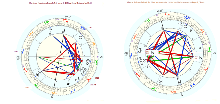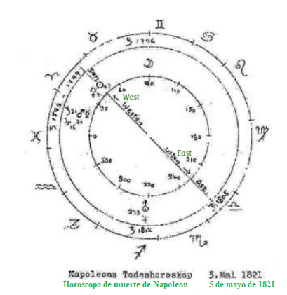 En esta sección se presentan las constelaciones de muerte de personalidades conocidas. A esto le seguirán observaciones que han surgido de años de estudio multifacético de la naturaleza del horóscopo de muerte. Primero, la constelación en el momento de la muerte de Napoleón, el 5 de mayo de 1821 en Santa Elena, por la tarde, cuando el sol se hundía en el mar. Sin embargo, primero debe preceder a esto una consideración general del horóscopo.