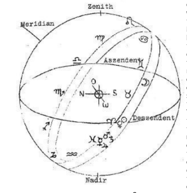 Aquí se contrastan dos tipos de representación: primero, el tipo habitual utilizado en astrología, pero también un registro tentativo en perspectiva de la imagen celeste en ese momento. Esto está destinado especialmente a aquellos que no están muy familiarizados con la notación astrológica habitual. Esto debería facilitar la transmisión de una impresión pictórica. Porque el primer tipo es comprensible para el «astrólogo», pero no es muy pictórico. Sin embargo, en la representación en perspectiva, el punto de vista se toma, por así decirlo, «fuera del espacio mundial», pero esta representación le resultará familiar al «experto» en cualquier caso.