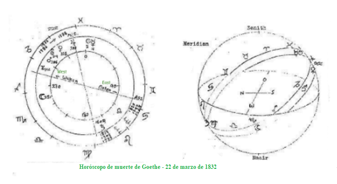 Finalmente, en 1827-1852, tenemos la conclusión del «Fausto». Si ahora recordamos lo que se dijo anteriormente sobre la diferencia esencial entre el mediodía elevado y la medianoche baja en el horóscopo de muerte de Goethe, encontraremos que recibe un cierto apoyo de lo que se esconde en los tránsitos de Saturno como un cuadro del destino en la constelación. Lo que se representa como eventos en medio del cielo revela más una inclinación hacia la naturaleza externa, en el altar del joven Goethe y en el viaje a Italia. En las profundidades del cielo se desarrollan eventos que están más relacionados con la experiencia de lo espiritual, con el esfuerzo hacia «los reinos de los antepasados elevados».