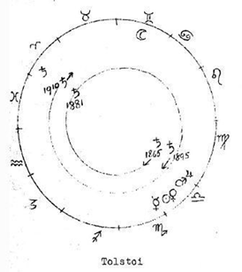 Tomemos de nuevo la constelación de la muerte de Tolstoi, tal como se representó anteriormente. Esta es la constelación en la que, como ya se ha dicho, casi todos los planetas están en Libra y Saturno está en oposición en Aries. Ahora se puede observar que Saturno, si se rastrea su órbita hacia atrás en el tiempo antes de la muerte de Tolstói, es decir, antes de 1910, ya había estado en el mismo lugar del zodíaco, en Aries, en 1881, y nuevamente en 1851, ya que se sabe que la órbita de Saturno a través del zodíaco dura casi 30 años. En este camino, también ha pasado por la ubicación cósmica donde ahora se encuentra el grupo planetario – en 1910 – en Libra, y eso fue aproximadamente en los años 1865 y 1895. Así, tenemos 4 puntos en el tiempo – 1865, 1881, 1895 y 1910 – en los que podemos hablar de transiciones o tránsitos de Saturno por lugares del zodíaco que fueron particularmente enfatizados más tarde, es decir, en el momento de la muerte de Tolstói, por la posición de los otros planetas.