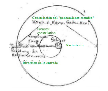 En este momento, nos encontramos con una constelación que exhibe una armonía cósmica particularmente notable, si dejamos de lado cualquier regla astrológica y miramos solo la imaginería de este fenómeno. Para reforzar la impresión pictórica, los signos zodiacales reales están dibujados en el círculo exterior, mientras que los signos solo están insinuados en el círculo interior. Ahora bien, este cuadro cósmico que emerge aquí puede ser visto desde dos «puntos de vista» diferentes: primero desde la luna como si estuviéramos en la luna mirando al espacio, y luego desde el punto de vista de la Tierra (las diferencias resultantes con las longitudes geocéntricas de los planetas no son muy significativas para nuestra consideración). Con esta doble perspectiva, podemos relacionarnos remotamente con la dualidad de los eventos que rodean la concepción: por un lado, la semilla espiritual que cae del alma y se conecta con la semilla física, y por otro lado, la contracción del cuerpo etérico del universo etérico por el alma, que aún vive en el ámbito lunar. (Aquí «Desc.», porque la luna estaba en el descendente de nacimiento al comienzo de la «constelación prenatal».)