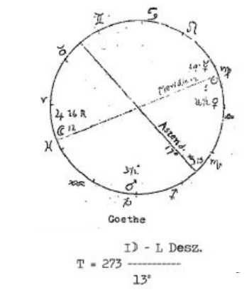 En el caso de Goethe, esta relación no es fácil de encontrar. Está fuertemente oculta detrás de ciertas complejidades de la constelación «prenatal», pero está ahí, apareciendo en la línea de oposición de Júpiter y Saturno en la constelación de muerte (Circular 3/4, pág. 16 y ss.). Se podría decir que Goethe transformó extraordinariamente su herencia cósmica durante su vida terrenal.