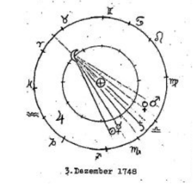 Vemos los planetas agrupados, principalmente en el signo de Capricornio. Particularmente en la forma en que Marte ataca al Sol, podemos ver una imagen de la ardiente devoción de Schiller al mundo de sus ideales. Cuando comparamos esto con la constelación de muerte, surgen conexiones interesantes. Vemos a Marte entrando en oposición a su propia posición en la «constelación prenatal». En contraste, el Sol, Venus y Mercurio están en oposición de manera opuesta a la «constelación prenatal» entre Saturno y Júpiter (véase el dibujo).