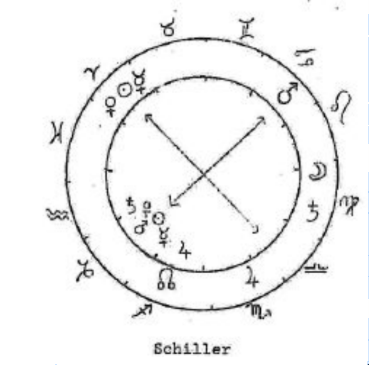 En el dibujo adjunto, la «constelación prenatal» de Schiller (círculo interior) y la constelación de muerte (círculo exterior) se yuxtaponen. Dado que la fecha de nacimiento de Schiller no se conoce con precisión, la primera constelación solo puede determinarse aproximadamente. Pero incluso en esta forma superficial, proporciona una visión profunda de la naturaleza de esta personalidad.