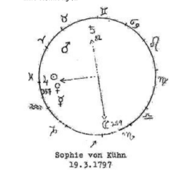 En el círculo interior (signos) está la «constelación prenatal», que tampoco puede determinarse con precisión en el caso de Novalis, ya que se desconoce su hora de nacimiento. En el círculo exterior (imágenes) está la constelación de muerte. Una vez más, es llamativa la íntima relación entre las dos constelaciones, que también se indica en el dibujo: Saturno en la misma ubicación cósmica, Júpiter en oposición a sí mismo. Son estos dos los que revelan los profundos secretos de Novalis. Si tomamos la constelación de Júpiter, la Luna y Saturno en la región de Cáncer en el momento de su muerte, llegamos, en el aspecto de los tránsitos retrógrados de Saturno, al tiempo posterior a la muerte de Sophie von Kühn. Allí encontramos el dolor inefable de la pérdida mortal, de este ser, pero también la gloria de los últimos dones del espíritu que Novalis legó a la humanidad con poder desbordante, que alcanzó su máxima expresión en el fragmento de «Heinrich von Ofterdingen» y en «El cuento de hadas de Klingsor». Ahora, desde una perspectiva cósmica, Cáncer y Leo son la esfera de los místicos, como se describió en la última Circular. Novalis está muy fuertemente conectado con esta región del mundo, que actúa como una puerta de entrada a los misterios cósmicos. Esto también se expresa en su «constelación prenatal», y hay que decir que transformó lo que se le dio de manera muy sublime en su muerte temprana. Pero también hay algo más que se puede ver allí, que solo se insinuará aquí. En el comienzo aproximado de la «constelación prenatal», el Sol, Mercurio y Saturno se encuentran en conjunción en el signo de Leo. Mercurio se encuentra entre Saturno y el Sol, pues tiene una conjunción superior con el Sol. Todo esto tiene lugar en el signo de Leo, que, en el sentido del ser humano cósmico, puede asociarse con el pecho, y Mercurio alado con los pulmones. Si colocamos esto junto al otro hecho que conocemos de la vida de Novalis, su delicada salud y la vulnerabilidad de sus órganos torácicos, esta conexión, también con referencia a la similitud de las dos constelaciones, la «prenatal» y la de muerte, nos aparecerá bajo una sublime luz cósmica.