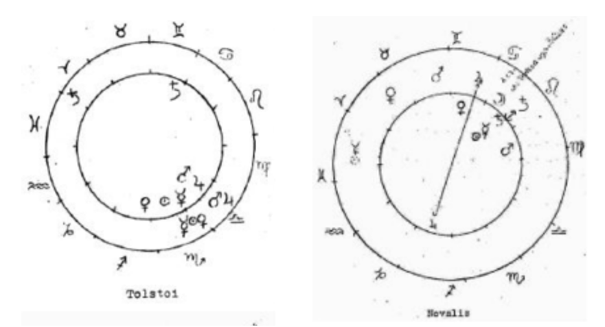 Otra constelación que revela la conexión entre lo prenatal y la muerte de una manera muy vívida es la de León Tolstoi. Nuevamente, el dibujo representa las constelaciones «prenatal» (interior) y de muerte (exterior). Sin embargo, también aquí, la falta de información fiable sobre la hora de nacimiento hace imposible determinar la «constelación prenatal» exacta. No obstante, está claro que la constelación de muerte refleja fuertemente la constelación prenatal. Esto es especialmente evidente en la conjunción de Marte y Júpiter en Libra. Sin embargo, este problema de Libra se eleva a un nivel superior en la constelación de muerte por la oposición de Saturno en Aries, transformándolo, por así decirlo, de la esfera de lo «arriesgado [empresa]» a la de la tragedia del destino vital. La conjunción Júpiter-Marte se cumple en la lucha que Tolstoi tuvo que soportar como individuo con aspiración artística y ética, por un lado, y como personalidad entrelazada con las formas burguesas de existencia, por el otro. La transformación de la predisposición prenatal a los problemas de la vida se expresa en la constelación de muerte por la oposición adicional de Saturno a los otros planetas.