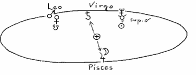 Es bastante difícil interpretar estos eventos, porque es un estudio realmente complejo. Pero podría ser útil si intentáramos formar una imagen. Los planetas en Leo y en Virgo forman algo así como el fondo en el cosmos de uno de esos altares medievales con tres grandes pinturas, una al lado de la otra. En la oposición, Júpiter se encuentra con la Luna, que como Luna creciente expresa más el poder de la creatividad universal, exigiendo reverencia de nuestra alma. La aparición de Júpiter en Piscis puede transmutarse en la Imaginación del Sumo Sacerdote del Cosmos que oficia en el Altar del Universo, o de la Tierra. Detrás de este Altar, allá en el espacio cósmico en Leo y en Virgo, aparecen grandes imágenes de ciclos evolutivos pasados que conllevan profundas implicaciones con respecto a nuestro tiempo presente. Es importante hacerse consciente de que el centro de esas «pinturas de altar» cósmicas es Saturno en Virgo. Lo que dijimos antes sobre el mensaje de este planeta es el impulso rector de toda la forma.