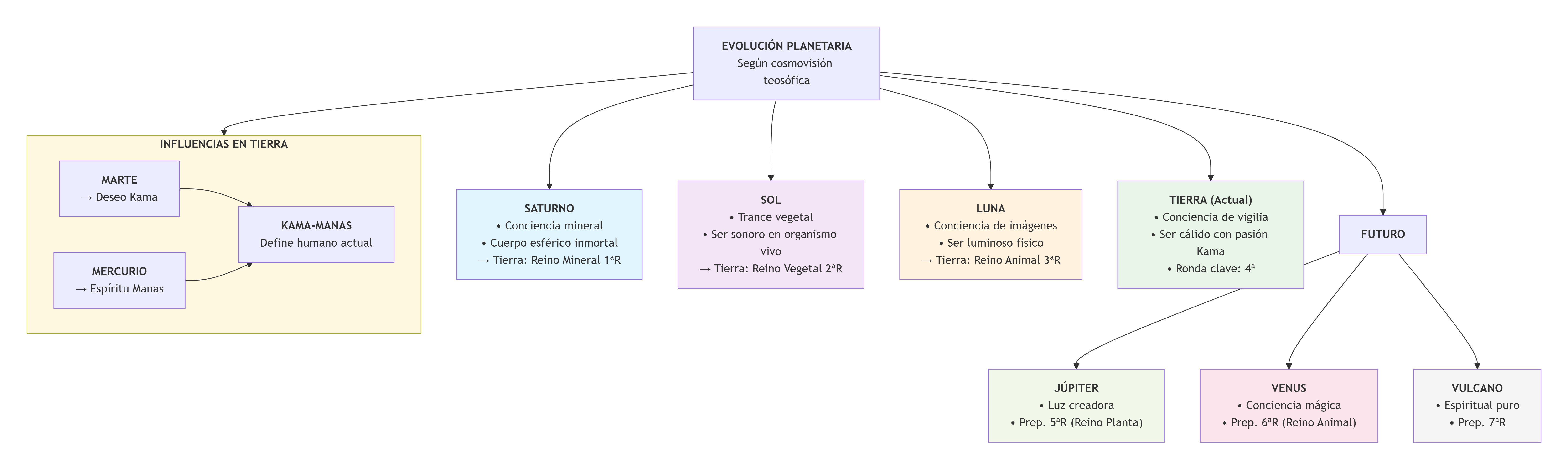 El clarividente no cuenta a la Tierra misma en el desarrollo planetario. Dice que es Marte y Mercurio juntos. La Tierra todavía tiene tres rondas por atravesar. Estas son importantes para las siguientes etapas planetarias. En la quinta ronda, entra en el reino vegetal. Luego vivira en una especie de paraíso, en el Jardín del Edén. Allí el reino más bajo será el reino vegetal. Todo lo que el hombre produzca allí será una planta. De esta manera, el hombre prepara lo que estará en el siguiente planeta. Este próximo planeta es esotéricamente llamado Júpiter. Es el Júpiter que surgirá de la Tierra. La sexta ronda, el reino animal, es una preparación para el sexto planeta, Venus —llamado así por su similitud con Venus. En el séptimo planeta, Vulcano, sigue la culminación. Ningún cerebro físico meramente puede concebir el estado del último planeta. Solo para el clarividente surge la posibilidad de saber algo sobre Vulcano.