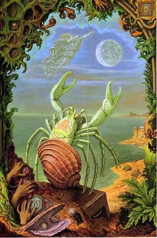 La constelación de Cáncer o ♋: aunque se trata de una constelación relativamente pequeña con pocas estrellas sobresalientes, parece que la cosmología antigua la consideraba importante. En Grecia se consideraba que era la puerta de nuestra encarnación, mientras que la constelación opuesta de Capricornio era la puerta a los dioses, después de la muerte. Esta perspectiva parece ser una continuación lógica de las implicaciones espirituales sobre Géminis-Gemelos. Allí nos encontramos con el gran alejamiento del Cielo y la Tierra, manifestándose en innumerables esferas de la existencia humana. Aquí, en Cáncer-Cangrejo, los dos mundos ahora se han separado por completo, lo que también se expresa en el símbolo que usamos para esta constelación: Las dos espirales se alejan una de la otra y dejan un espacio o abismo entre ellas. En el símbolo de Géminis, los dos mundos todavía están conectados entre sí.