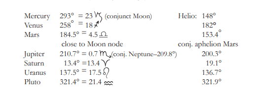 Para encontrar la correlación prenatal de este evento, avanzamos con la Luna desde el 7 de enero de 1792 (que refleja 14 años de edad) por 4 x 51,4 ° (ver arriba), y llegamos al 23 de enero de 1792, como el correspondiente equivalente de tiempo. La Luna estaba entonces en 293° de la eclíptica o 23°♑ (o 87 ° + (4 x 51,4 °) 206 ° = 293 o 23°♑). Las posiciones de los planetas en ese día fueron (todas geocéntricas):