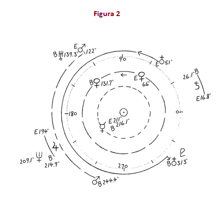 Equivalente heliocéntrico, incluidos los movimientos planetarios desde la época (E) hasta el nacimiento (B). En la época: la Tierra está cerca del nodo de Marte, Venus está cerca de su nodo, Marte está cerca del nodo de Neptuno y Júpiter está cerca de su afelio. Al nacer: Venus está cerca de su perihelio.