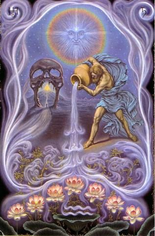 Mientras que en Capricornio tenemos una representación del portal al cosmos, Acuario-♒ refleja algo del esplendor del cosmos mismo. En la cosmología india, esta constelación era Varuna, el gran dios hindú, que ocupaba el segundo lugar después de Indra en importancia. Parece haber sido el mismo que fue reconocido en la concepción del mundo persa antiguo como Ahura Mazdao, el gran Aura del Sol. Él era el guardián de Rita, el orden cósmico, y había creado los ritmos en el universo, como el día y la noche, las estaciones, etc., todos ellos hechos por ritmos cósmicos. Lo opuesto, «Nonrita», o An Rita, se convirtió en días posteriores en «una de las palabras más comunes para la falsedad y el pecado» (Basham, La maravilla que era la India). Asimismo, el oponente del orden cósmico de Ahura Mazdao, Ahriman, fue considerado como el padre de los elementos mentirosos del cosmos, y el cuerpo, particularmente la cola del pez, nos transmite a las «aguas del abismo».