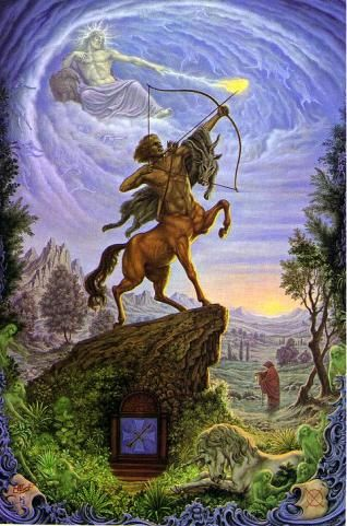 Así es Sagitario, el Centauro, una representación dinámica de las primeras etapas del devenir humano. Heracles, cuya efigie en el cielo se erige como un recordatorio externo de un prototipo cósmico humano y futuro objetivo espiritual, como dijimos cuando hablamos de Escorpio, mata o vence al centauro en sí mismo. Lo hace porque su tarea es convertirse en un habitante de la Tierra que se hace consciente de su yoidad. Por esta razón, debe sacrificar su propia herencia cósmica, el cuerpo del caballo, que representa nuestra profunda participación antigua y sin yo en el cosmos.
