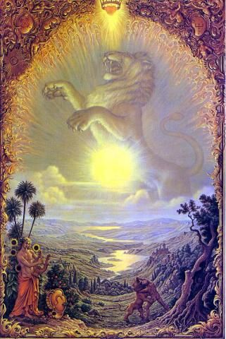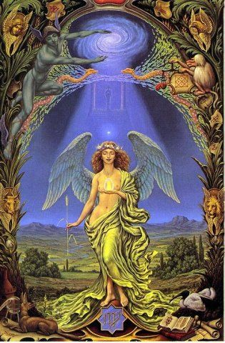 Sin embargo, toda la transformación promulgada en el cuerpo humano y en el mundo, que emana originalmente de las regiones espirituales más allá de Virgo, apunta al logro de las metas evolutivas. La mitología lo expresa mediante la imaginación del niño, que a menudo tiene características representativas del alma de la humanidad en su viaje a través de las vicisitudes de la vida terrena, entrando invariablemente en conflicto con el mal del mundo y finalmente superándolo. Así, el camino hacia el futuro se libera de obstáculos. La gran imaginación del Capítulo XII del Apocalipsis de San Juan presenta tal perspectiva. La «mujer vestida del Sol, y la Luna debajo de sus pies y sobre su cabeza una corona de doce estrellas» es una imagen de lo que podemos llegar a ser en el futuro, si nos hemos realizado plenamente como un «yo» y el potencial espiritual escondido «detrás» de la región de Virgo. Entonces nacerá nuestro fruto o esencia espiritual; nuestro ser y limitación, que alguna vez fue material, desaparecerá. «Y dio a luz un niño que gobernará a todas las naciones con vara de hierro, y su hijo fue arrebatado para Dios y su trono». El dragón de siete cabezas y diez cuernos se paró ante la mujer para devorar a su hijo y así obstruir el camino hacia el futuro. Pero él y su hueste fueron derrotados por el Arcángel Miguel y sus ángeles.